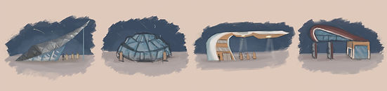 Concept design for a pilot, a gas station, and a spaceship.